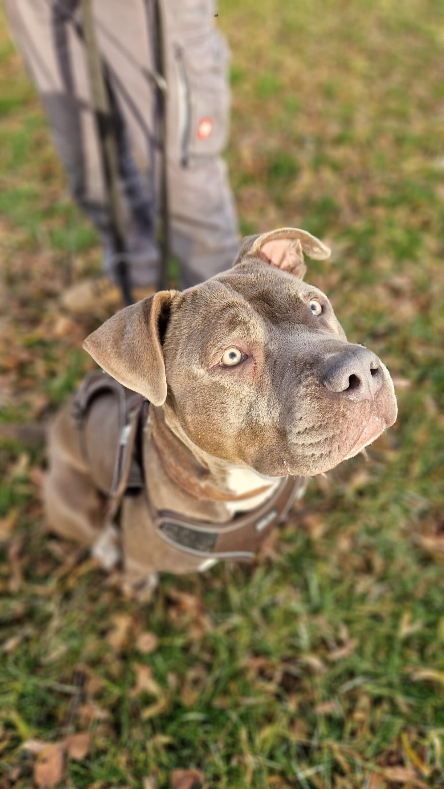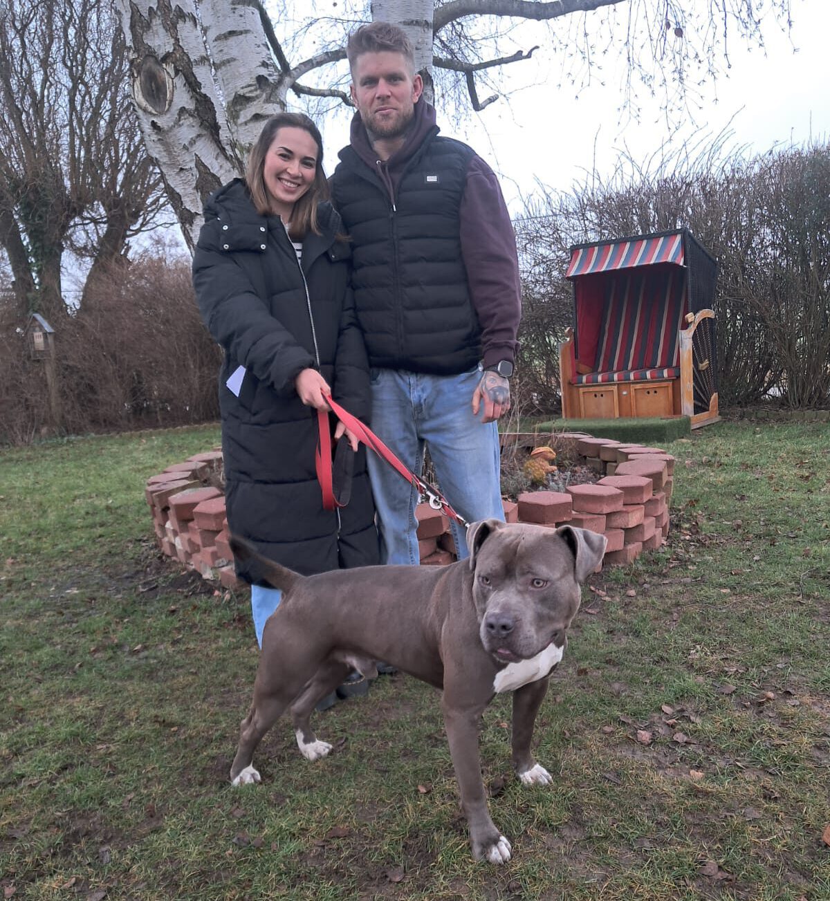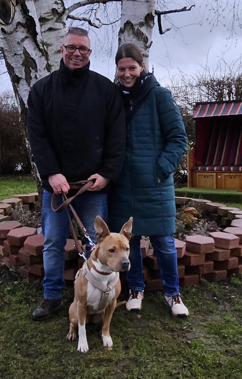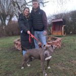 American Staffordshire Terrier Mix Lord hat alle mit seinen blauen Augen und dem zauberhaftem Charme um die Finger gewickelt. Und so ging es auch bei Lord ganz schnell, dass er sein neues zu Hause gefunden hat.